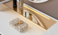 | Karyola | 160*200 ölçülerinde baza fonksiyonu bulunmaktadır. Suntalam malzeme üzerine döşenen kaliteli kumaş ile üretilmiş olup, başlık kısmında temizliği kolay, silinebilir kumaş tercih edilmiştir. İsteğe göre başlık kumaşı değişebilir. Led Aydınlatma bulunmaktadır. |